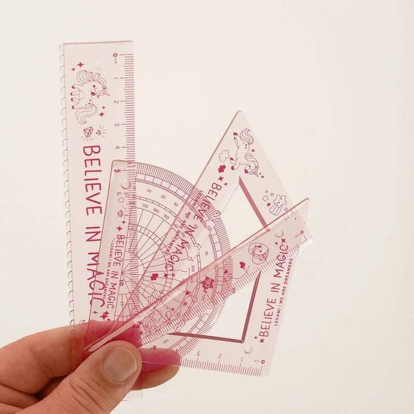 Nella vita è importante avere una buona squadra che ci supporti. Ma anche un righello e un goniometro! Detto, fatto: il Set di Geometria - You Rule! è pronto a entrare in ogni kit da disegno e accompagnarti a scuola o al lavoro. E se i tuoi piani cambiano continuamente, non preoccuparti: è in materiale super flessibile.